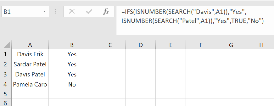 =IFS(ISNUMBER(SEARCH("Davis",A1)),"Yes",ISNUMBER(SEARCH("Patel",A1)),"Yes",TRUE,"No")