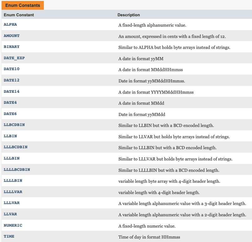 为了与银行集成,我正在用j8583库(v1.17.0)实现iso消息,文档中说有可能创建IsoType.LLLLVAR格式的字段: