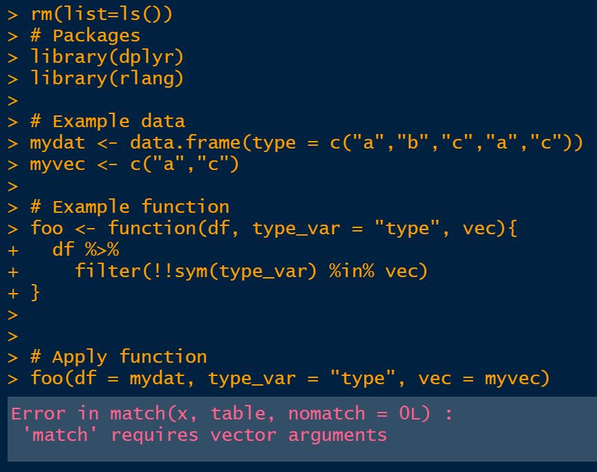 reprex::reprex()运行它时(从控制台输出中截图),函数将根据列与另一个向量的匹配筛选data.frame行(控制台输出中的截图)显示,在脚本中直接运行完全相同的代码会抛出一个'match' requires vector arguments error.!!sym()似乎正在创建某种时间序列对象的函数进行轻微修改。省略sym()并将==替换为%in%具有相同的==更新: