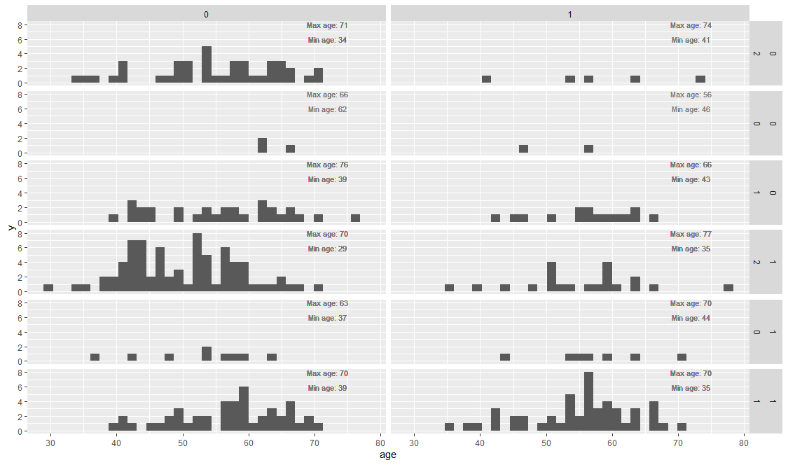 这里我使用Kaggle心脏病发作分析数据。我下载并解压缩数据,然后在heart.csv中读取。我将数据分为3个因素(性别,slp,exng),并在每个子集中得到最大和最小年龄。然后,我用因子来绘制年龄图。我要地块右上角的最大和最低年龄。但是,我只能知道如何在一个图中完成这个任务(不需要平面网格步骤)。
