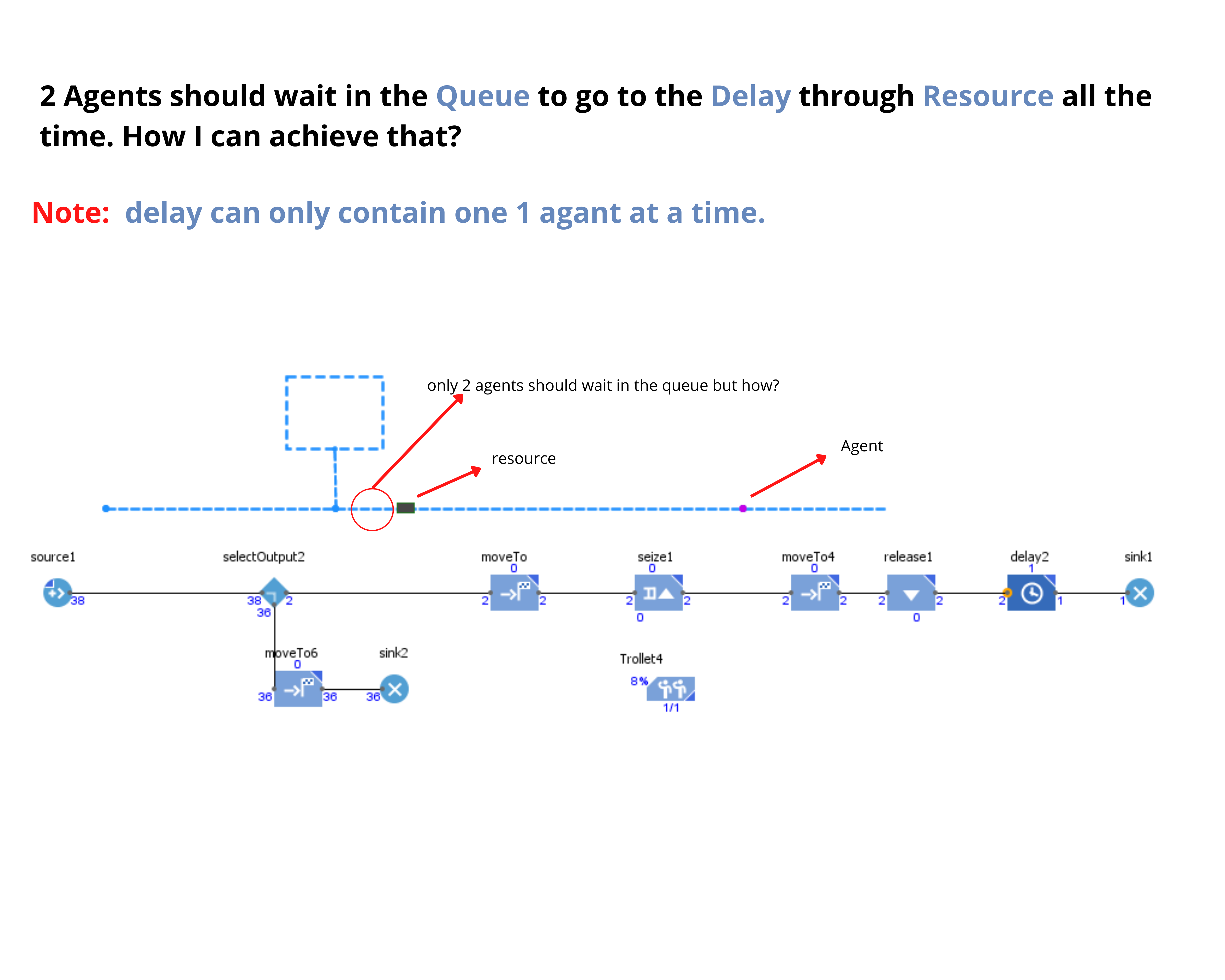 问题:现在唯一的问题是,两个代理如何在队列中等待,然后转到延迟部分。解释如下图所示。