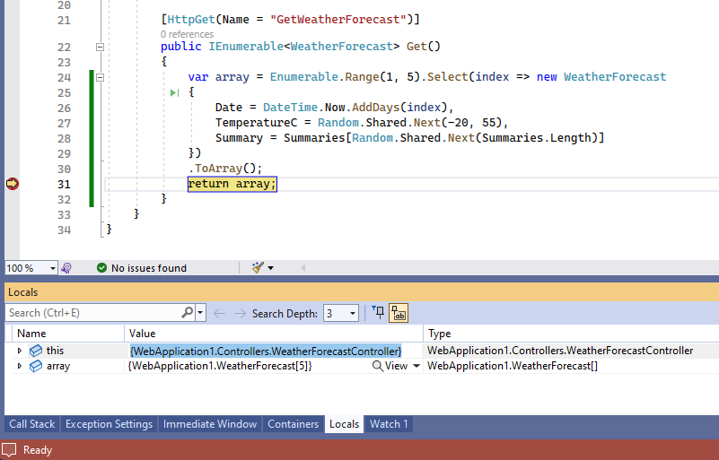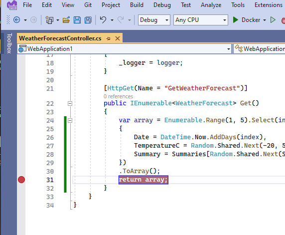 使用Docker调试IEnumerable核心WebAPI项目时,无法使用ASP.NET可视化器放大镜。