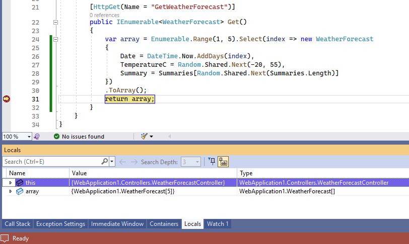 注释可视化放大镜可在“局部变量”窗口中的“数组”变量上使用