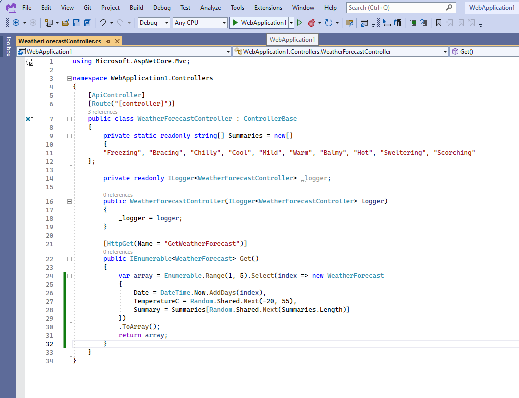 var array = Enumerable.Range(1, 5).Select(index => new WeatherForecast