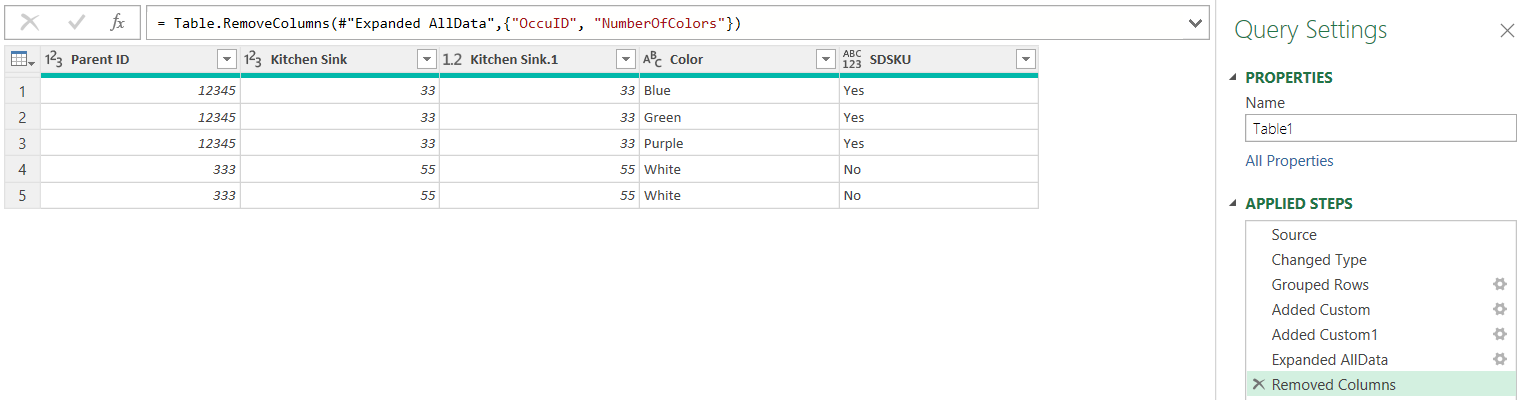 #"Expanded AllData" = Table.ExpandTableColumn(#"Added Custom1", "AllData", {"Kitchen Sink", "Color"}, {"Kitchen Sink.1", "Color"}),
