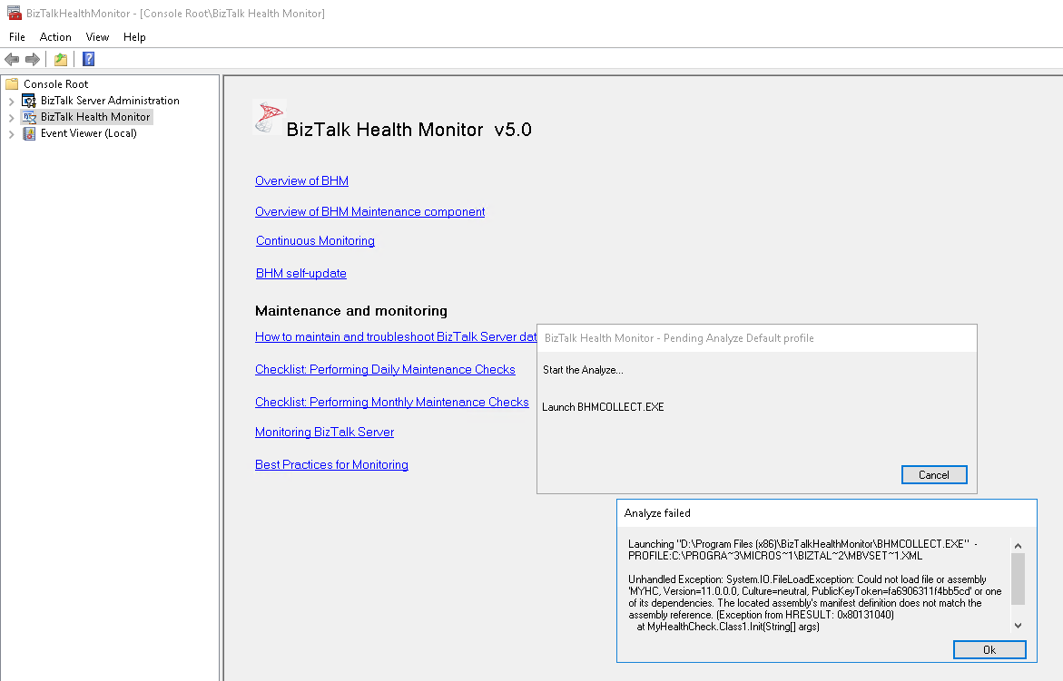 我正在BizTalk 2016上运行BHM50.exe (BizTalk健康监视器)上的“立即分析”。我以管理员的身份开始工作,我应该拥有所有必要的特权。