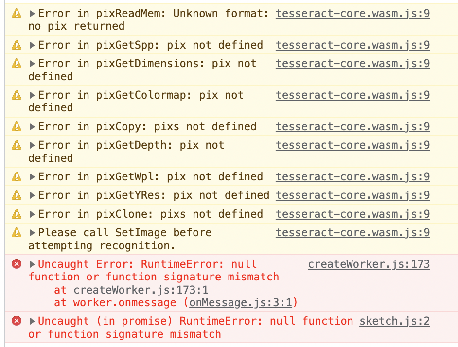 当我在URL上运行tesseract.js时,它工作得很好。但是,当我在本地文件上运行它时,我会得到这些错误。我怎么才能解决这个问题?