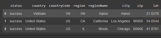 df = [df] response = requests.post("ip-api.com/batch", json=df ).json() response response = pd.DataFrame(response)