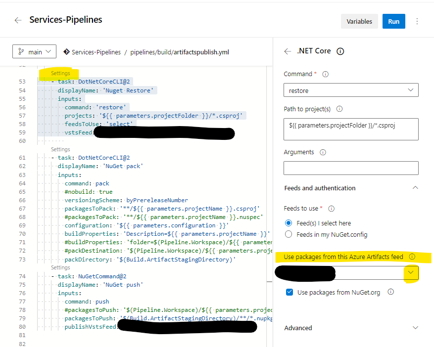 我也有类似的问题,试图在Azure Devops中发布一个Nuget神器,并且必须添加相同的恢复任务。在"nuget“任务之前运行时,下面的代码对我有效。您可以对参数值进行硬编码以满足您的需要,但在下面的示例中它们是从父级传入的。