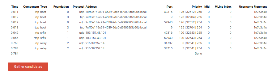 )我试着启动这个应用程序,直到我把我的设备从本地的Wifi连接到4G移动数据之前,它才能正常工作。这无疑意味着两个设备在不同的网络背后。因此,我将ICE服务器从openrelayproject改为公共转服务器。我已经测试了转服务器,它运行正常的基础上的涓滴ICE。