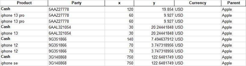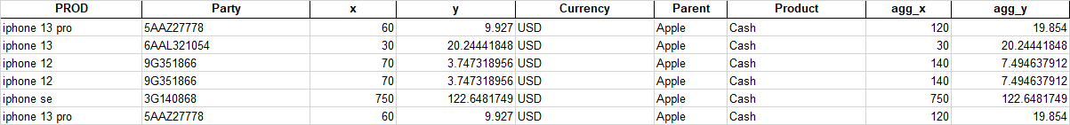 cols2 = ['Product', 'Party', 'agg_x', 'agg_y', 'Currency', 'Parent']