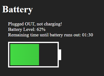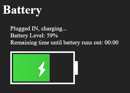HTML5电池状态API (重做,代码如下所示)有一个问题。剩下的时间(直到电池耗尽)没有出现。我尝试从JavaScript上的原始项目复制CodePen。这是行不通的。我查了密码没发现有什么问题。没有显示错误。原文:https://codepen.io/lnfnunes/pen/mEZzBa CodePen