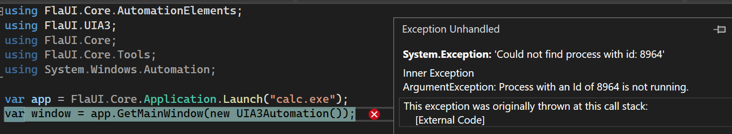 at Program.<Main>$(String[] args) in C:\Users\jekug\source\repos\FlaUI test\FlaUI test\Program.cs:line 10