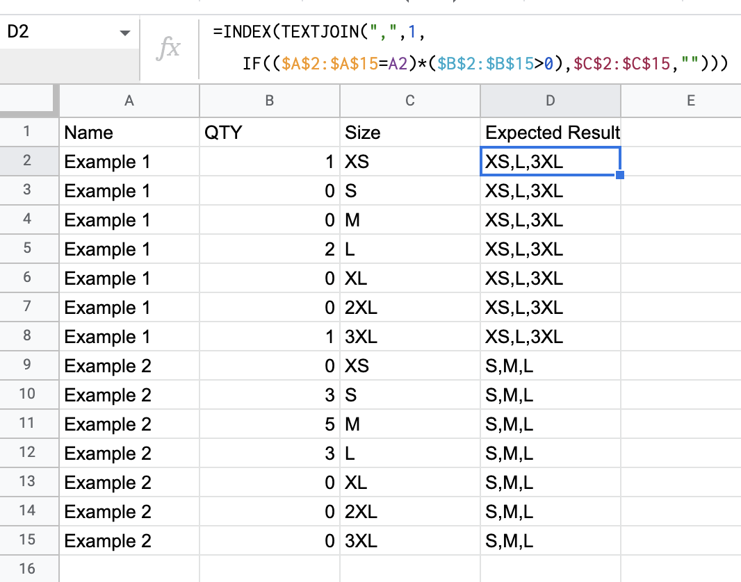 我试着在一个单元里展示独一无二的产品的尺寸。但是,我目前有以下内容,它在应该为空的单元格中返回FALSE。