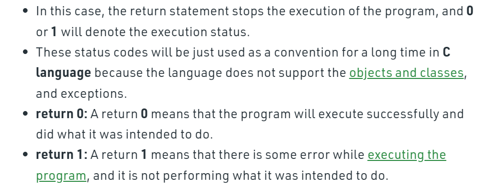 如果主函数的返回类型是与int兼容的类型,则从初始调用到主函数的返回等同于调用退出函数,其参数由主函数返回;到达终止主函数的}返回值为0。如果返回类型与int不兼容,则未指定返回到主机环境的终止状态。