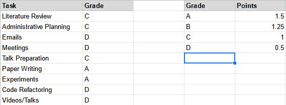 我试图创造各种数值,以更好地跟踪我的工作,而不是简单地根据时间,即某一特定类别的工作被分配更多的“点”比另一类工作基于某种主观的困难。因此,我创建了一个Google电子表格,但是要计算所有这些。