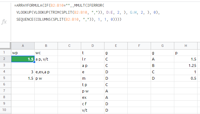 VLOOKUP(VLOOKUP(TRIM(SPLIT(B2:B10, ",")), D:E, 2, ), G:H, 2, ), 0),