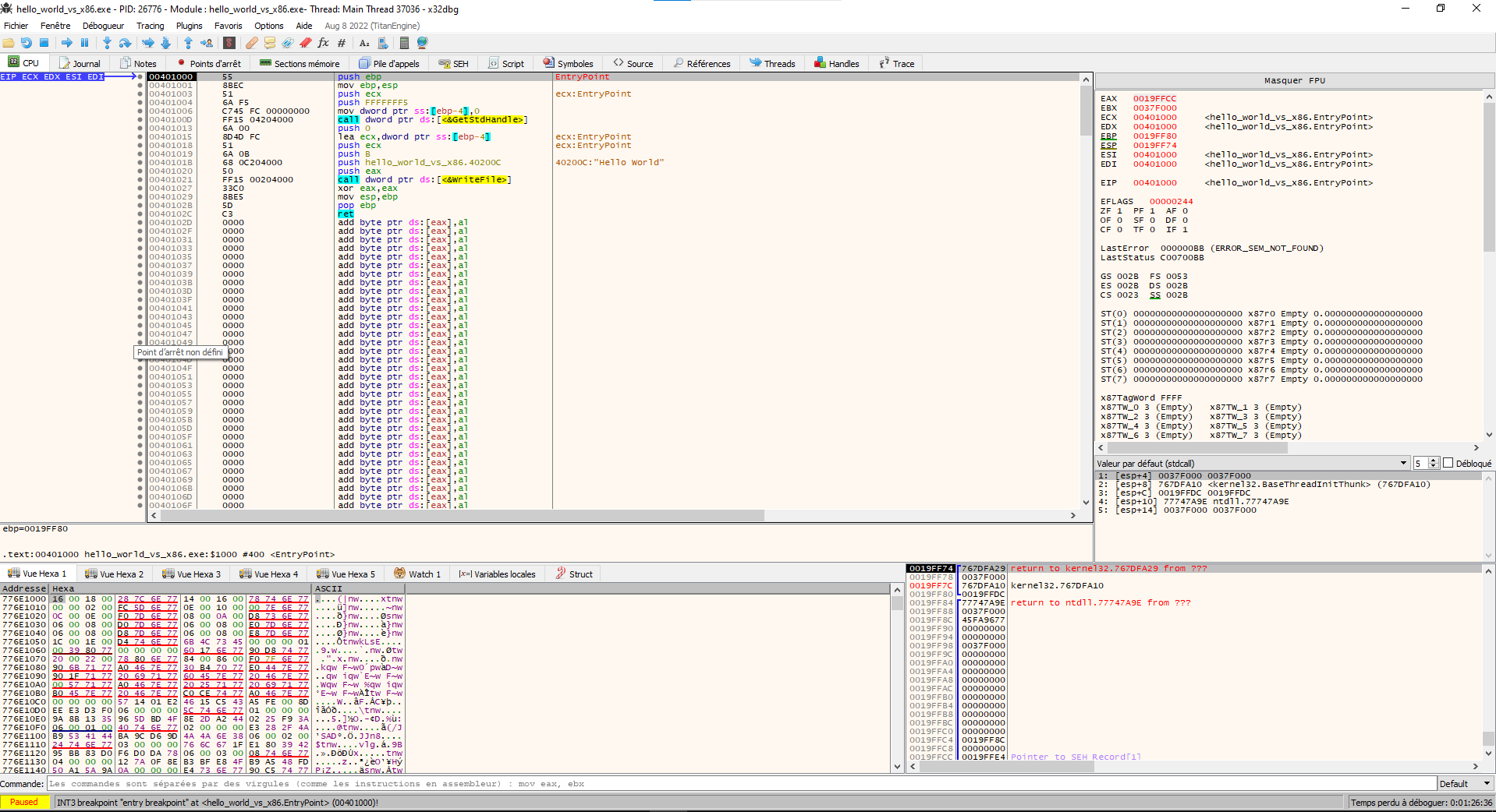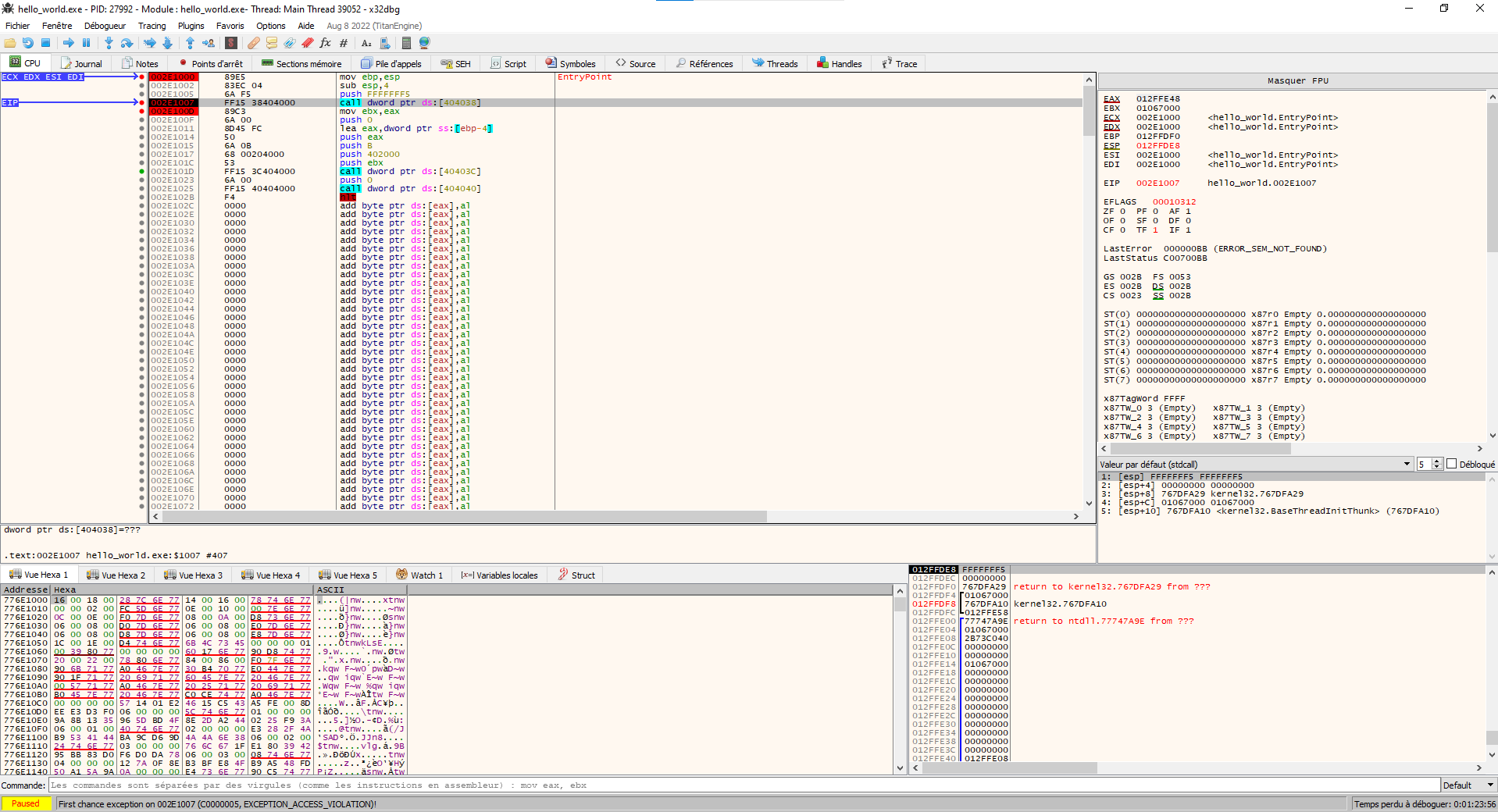 这里是一个调试会话的捕获,第一次“调用”指令崩溃。