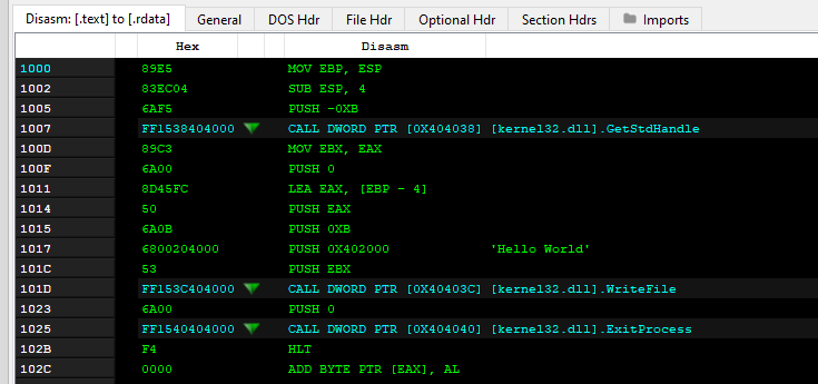 我使用导入表、ILT、IAT和提示/名称表管理.idata部分的创建。当我使用PE文件检查工具,比如PE-熊,一切看起来都很好,并且在.text节的反汇编视图中,PE能够找到“调用”指令所引用的函数的名称。