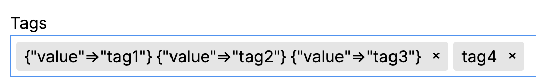 我在Rails 7应用程序上使用@yairEO/tagify。我几乎可以用了。它将作为有效的JSON保存到数据库中。如果在返回表单进行编辑之后,使用带有3个标记(例如tag1、tag2、tag3 )的标签提交表单,那么标签化将这3个单独的标记组合成一个标签。