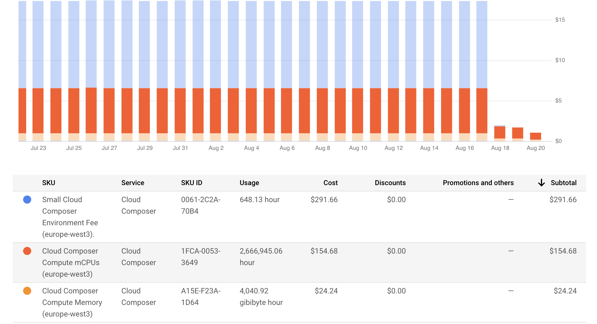 我有Composer 2实例并删除了它,但由于某种原因,Composer和内存仍被收取一些费用。会不会是延迟收费什么的?我想可能是,但已经过了几天了,我还在看指控。云编写器环境费在删除后不收取,它只收取CPU和内存。