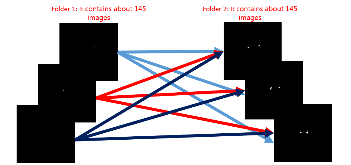 我有两个文件夹的图像,每一个包含大约145张图片。我想测量相似度,找出哪些图像匹配相应的图像,哪些图像具有最高的相似性。让我们假设,取决于这两个点的中心之间的距离。但是度量相似性的尺度不应该取决于出现在每幅图像中的两个点的直径大小。