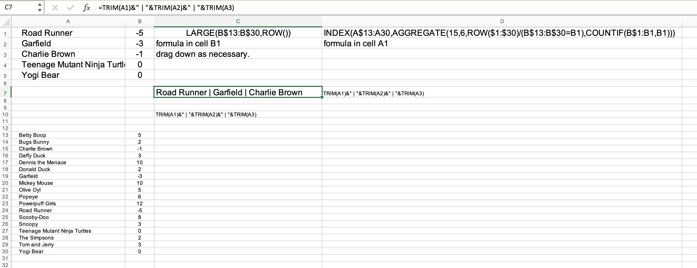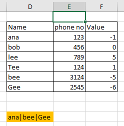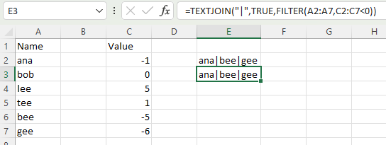 =TEXTJOIN("|",TRUE,FILTER(A2:A7,C2:C7<0))