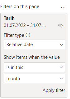 if [Date] >= _thismonthstart && [Date] <= _thismonthfinish then 1 else 0或者,您可以在视觉上使用筛选器。
