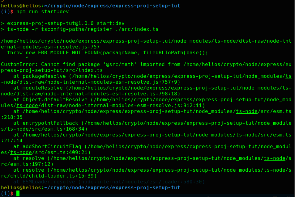 我无法解决您在package.json中配置模块和在tsconfig.json中配置模块的问题,但是如果您从package.json中删除"type": "module"并在tsconfig.json中更改为"module": "CommonJS",您将能够运行"start:dev": "ts-node -r tsconfig-paths/register src/index.ts"。