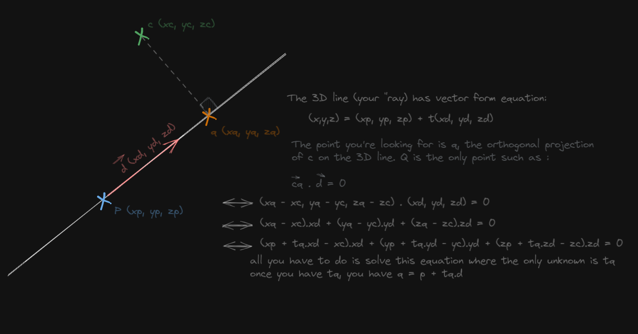 我目前正在制作一个3D引擎,为了照明,我必须做的一件事就是投出一条3d射线,并在这条光线上找到与另一个给定点最近的点。我的问题是,有没有人知道在代码中有一种有效的方法来做到这一点?