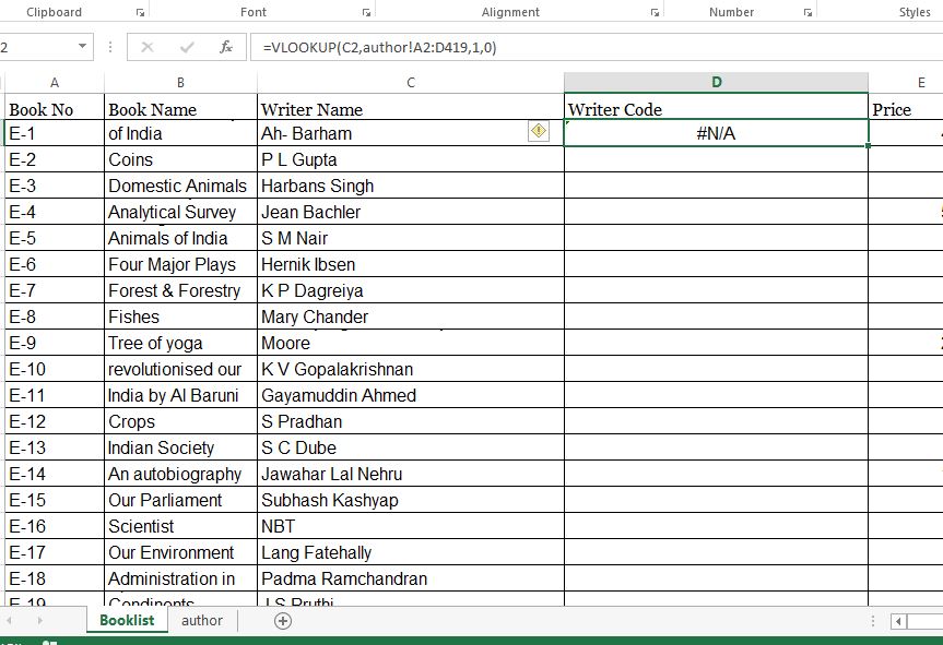 =VLOOKUP(C2,author!A2:D419,1,0)但这不管用,请帮帮我,这是错误的