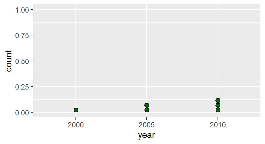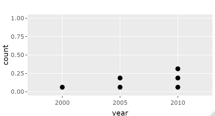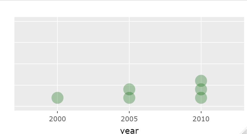 df <- data.frame(年份=c(“2000年”、“2005年”、“2005年”、“2010年”、“2010年”、“2010年”)、名称=c(“乔治”、“迈克尔”、“鲍勃”、“詹姆斯”、“威尔”、“法布里齐奥”)、ggplot(df,aes(x =年份))+ geom_dotplot(堆栈比= 1,填充=“深绿色”,stackgroup= TRUE)
