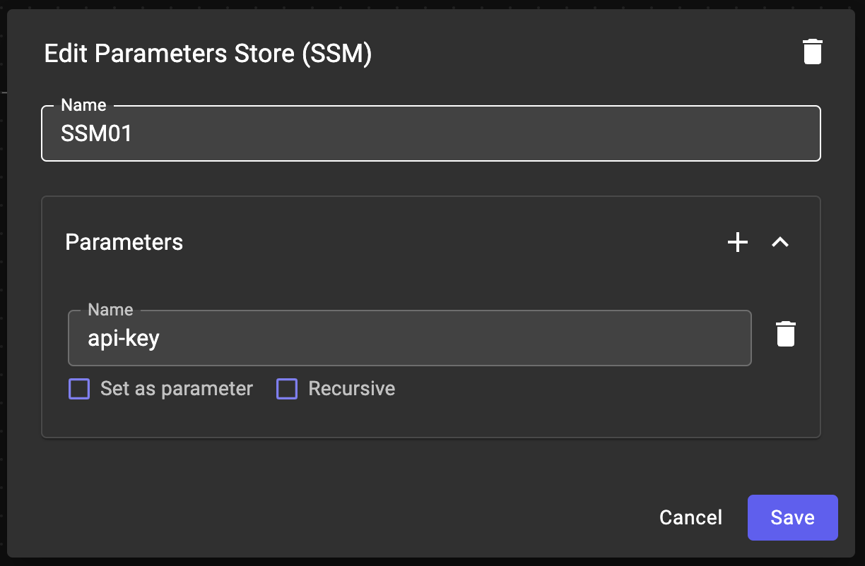 可以向Altostra项目添加SSM参数引用,并在Lambda中使用它,如下所示:
