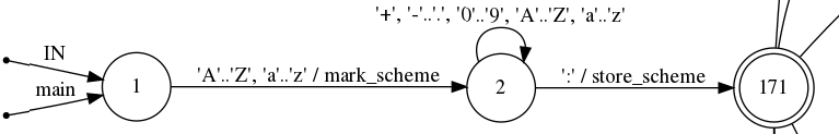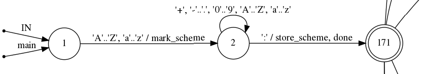 现在您可能想知道为什么171是最后的状态之一,这是因为hier_part和其他东西一样可以是path_empty,也就是zlen,所以机器可以在这个状态(对于scheme:输入) ->中完成--这是在转换到这个状态时执行的最后状态之一-> @done。