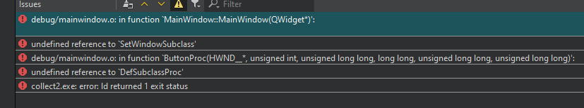 它应该是编译器的LIBS += -lcomctl32,而不是您尝试过的其他几个选项。这个相关的问题还有更多的细节:在Qt项目中添加外部库