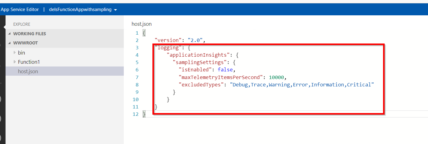为了禁用采样,我尝试了host.json文件的各种配置,该文件的当前内容是: