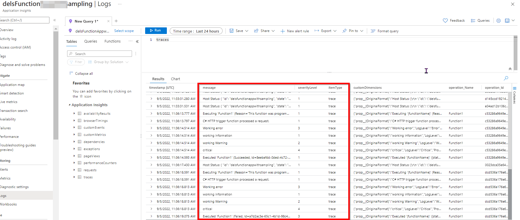 我试着重复你的问题。我能够获得所有的遥测信息在应用洞察力后,禁用抽样。