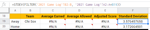 =STDEV(FILTER('2021 Game Log'!B2:B, '2021 Game Log'!A2:A=B19))