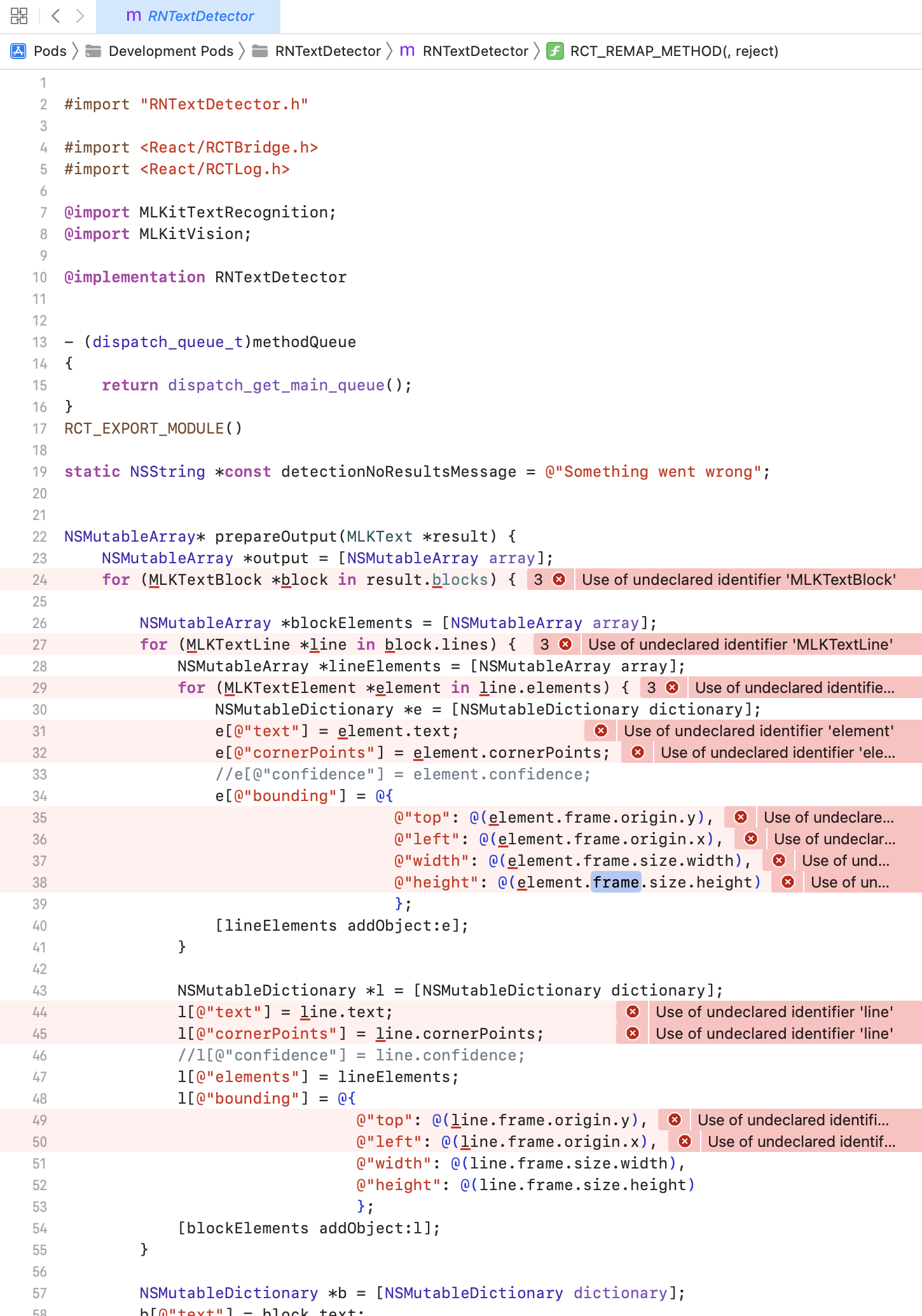 npm install来安装node_modulespod install创建Pods文件夹在第4步,应用程序几乎成功构建,但在文件RNTextDetector.m (路径为{Root}/node_modules/rn-text-detector/ios/RNTextDetector.m)中出现错误。其中大多数是“使用未声明的标识符'xxx'”。以下是错误: