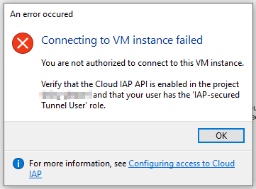 但是,我最近在mix中添加了一个Ubuntu22.04LTS实例,并且无法通过IAP连接到它。我可以使用GCP中的ssh选项来连接,但不能使用IAP。当试图通过IAP连接时,我收到了以下错误: