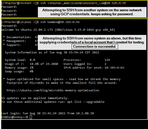 编辑以从同一网络上的另一个系统添加ssh测试的屏幕截图。SSH测试是用本地创建的帐户和我的GCP凭据完成的。