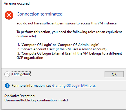 我已经配置了IAP,并使用它连接到GCP中的几个实例。所有必要的权限和防火墙规则,我应该需要到位(IAP-安全隧道用户,所有者,安全管理),这是完美无缺地工作在所有其他实例。