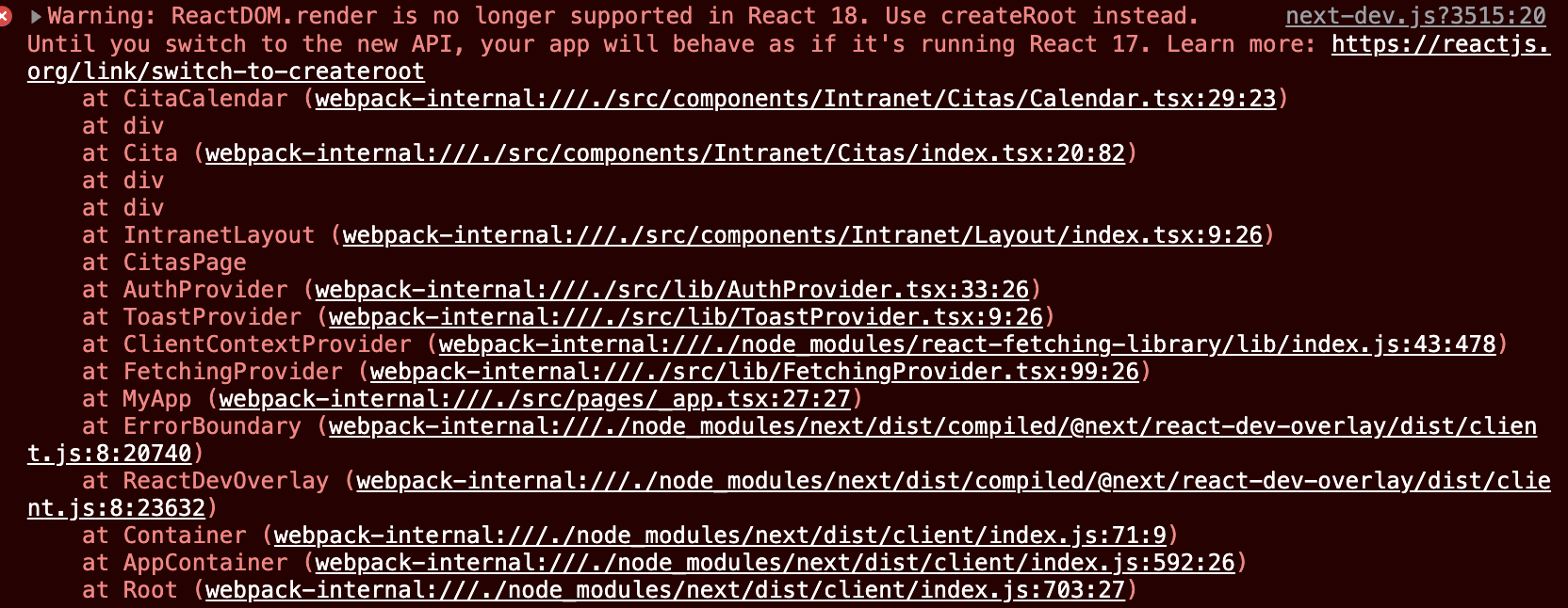 正如错误提示的那样,我尝试过使用createRoot,但是它也给了我一个错误(而且afaik只用于根组件,所以我不喜欢使用它)。
