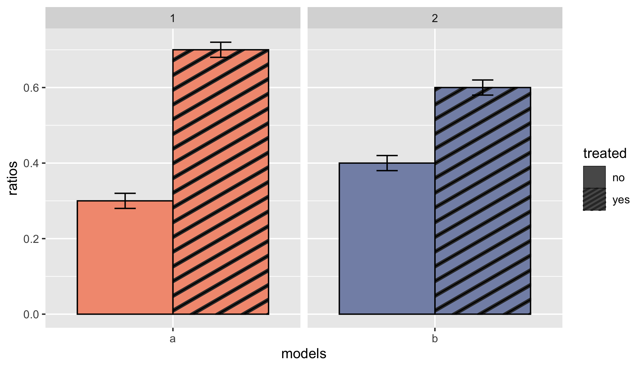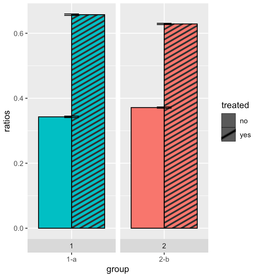 group的意义。海事组织,这是不必要的。TBH,我也不明白models和task的意义:如果任务= "1“那么模型= "a";如果任务= "2”那么模型= "b";所以任务和模型是多余的,因为它们编码相同的东西(不管你叫它"1"/"2“还是”a“/”b“)。?scale_col_pattern,您可以使用pattern_key_scale_factor参数来调整这一点。在这里,我选择了pattern_key_scale_factor = 0.2,但您可能想使用不同的值。geom_errorbar不知道有不同的task-treated组合。我们可以通过显式定义group美学,通过task和treated值的组合来解决这个问题。您在aesthetic.data.frame.中定义了实际的颜色值,则您已经允许通过pattern使用treated值,希望使用scale_fill_identity()。