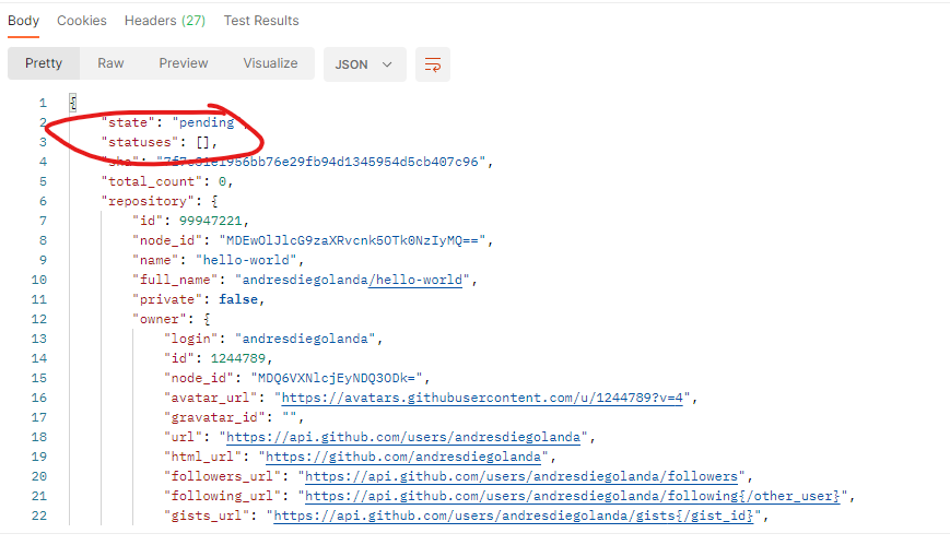 https://api.github.com/repos/andresdiegolanda/hello-world/578138334ad1f8dc874886ed2afb99e3265565be我没有看到/statuses/部分。