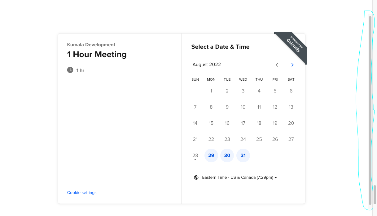 <div class="calendly-inline-widget" data-url="https://calendly.com/kumaladevelopment/60min" style="min-width:320px;height:630px;"></div>