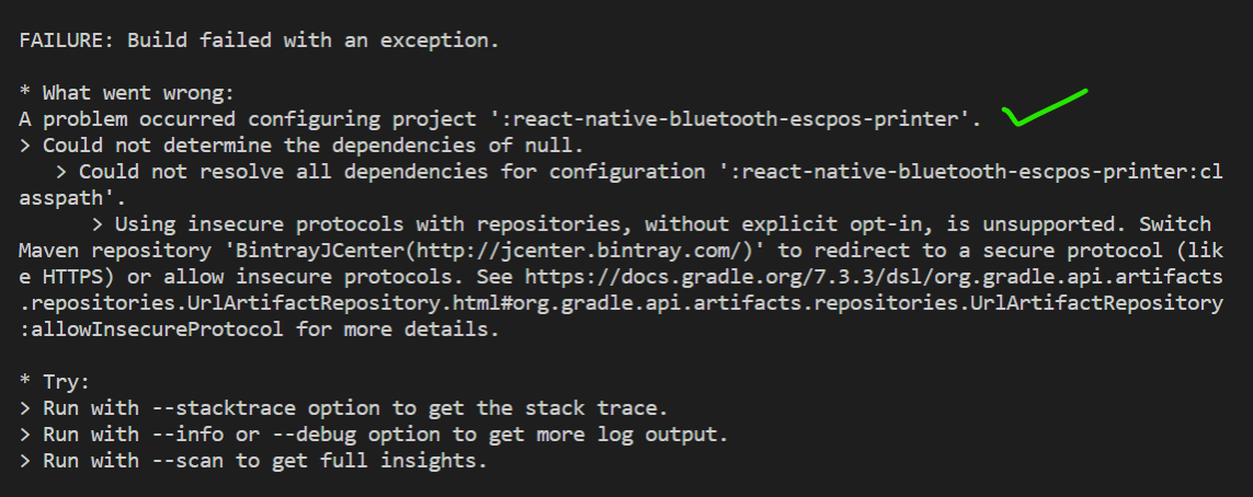 因为没人能维持这个包裹。我使用了https://github.com/januslo/react-native-bluetooth-escpos-printer/pull/114,它是这个包的PR之一,它解决了不安全的协议,并使用https://www.npmjs.com/package/patch-package来保持更改。希望能帮上忙!