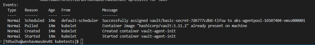 app: basic-secret当我描述部署的pod (kubectl describe pod basic-secret-7d6777cdb8-tlfsw -n vault)时,我得到: