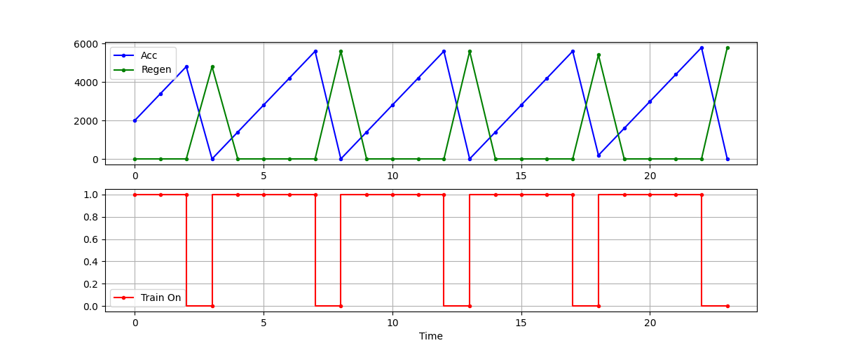当我努力为5列列车获得一个可行的解决方案时,我将问题简化为一列列车,其临时目标是测试再生调度。这个问题目前是离散的,因此整个再生周期适合于一个时间步骤。代码附在下面。