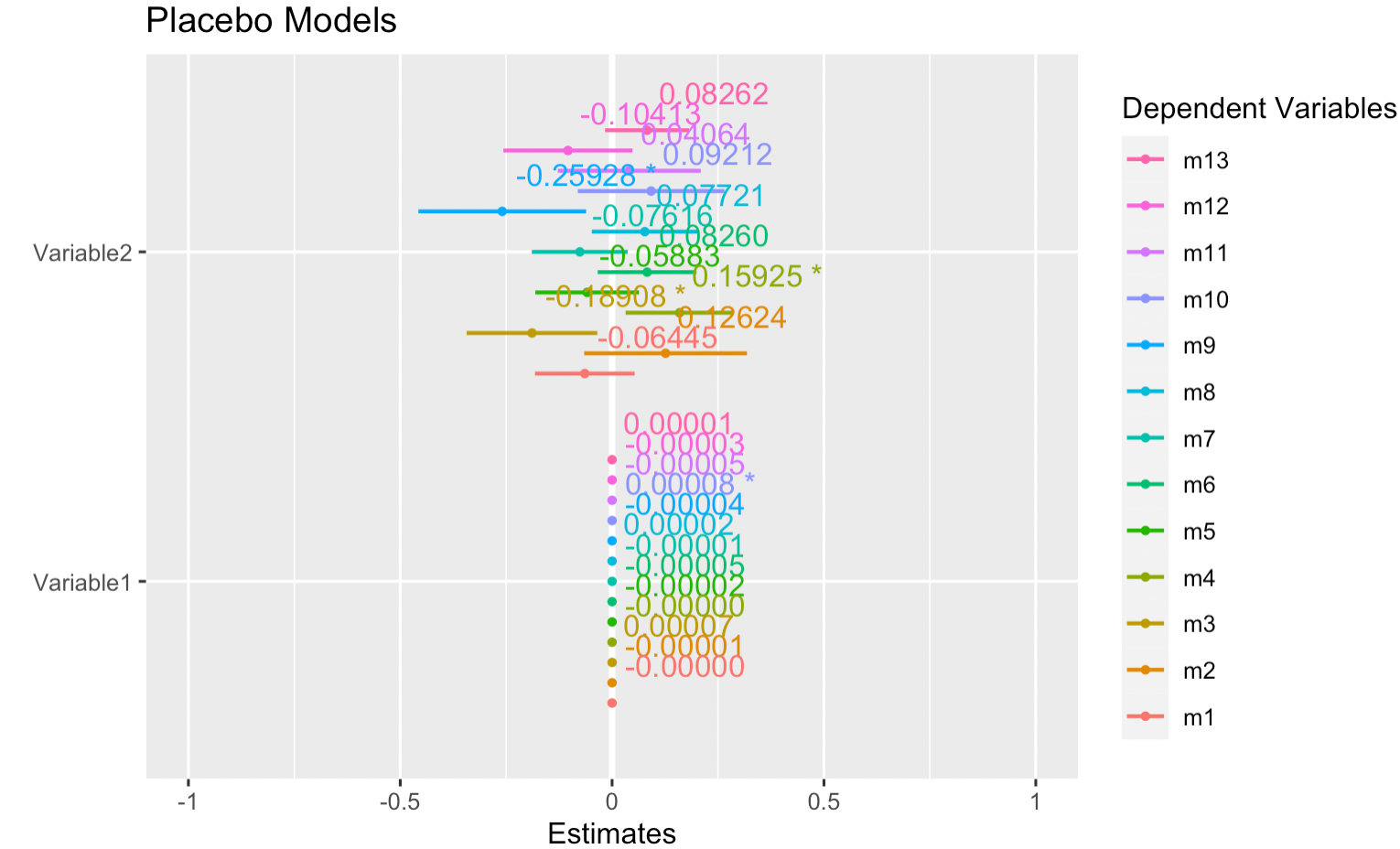 testplot <- plot_models(models_list, colors = c("RED"), show.values = TRUE, p.threshold = 0.05, spacing = 0.8, dot.size = 1, digits = 5, title = "Placebo Models", axis.labels = c("Variable1", "Variable2")) + scale_color_discrete(labels = c("m1", "m2", "m3", "m4", "m5", "m6", "m7", "m8", "m9", "m10", "m11", "m12", "m13"))我当前的绘图输出如下: